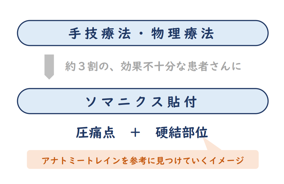 ソマニクスの貼り方ですが、圧痛点+硬結部位という組み合わせで貼付することが多いです。硬結部位に関しては、アナトミートレインを参考に見つけていくイメージです。