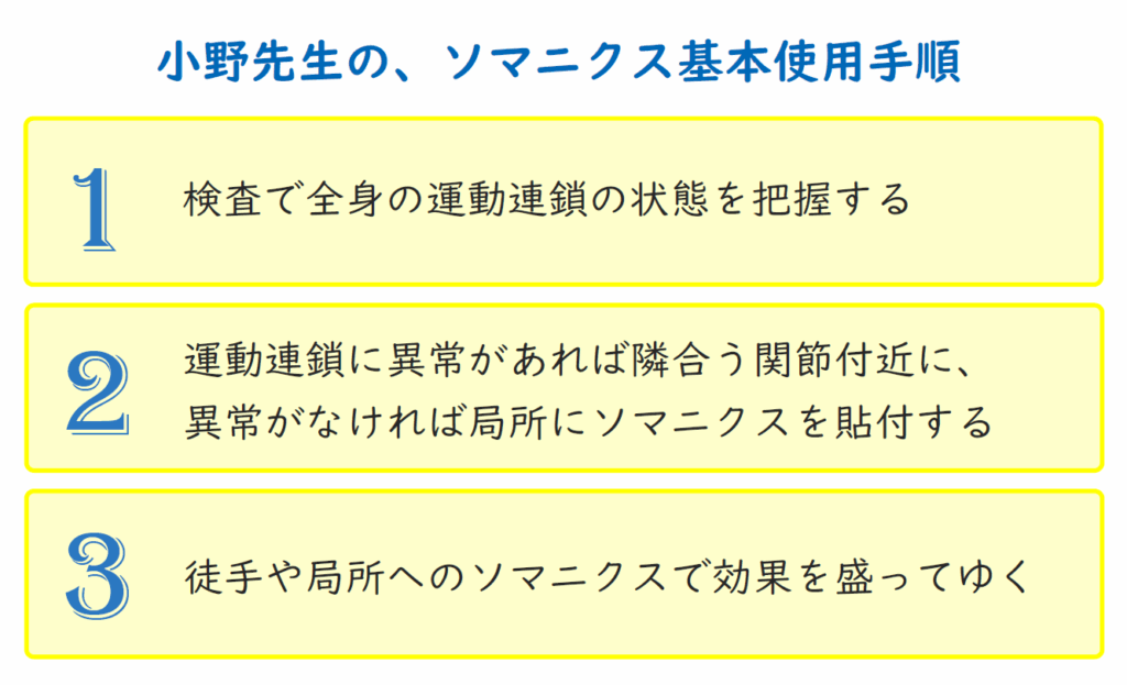 主に手技療法との組み合わせで使っています。手技療法の前にソマニクスを貼って、筋肉の状態を良くしてから手技を行うと効果が全然違います。