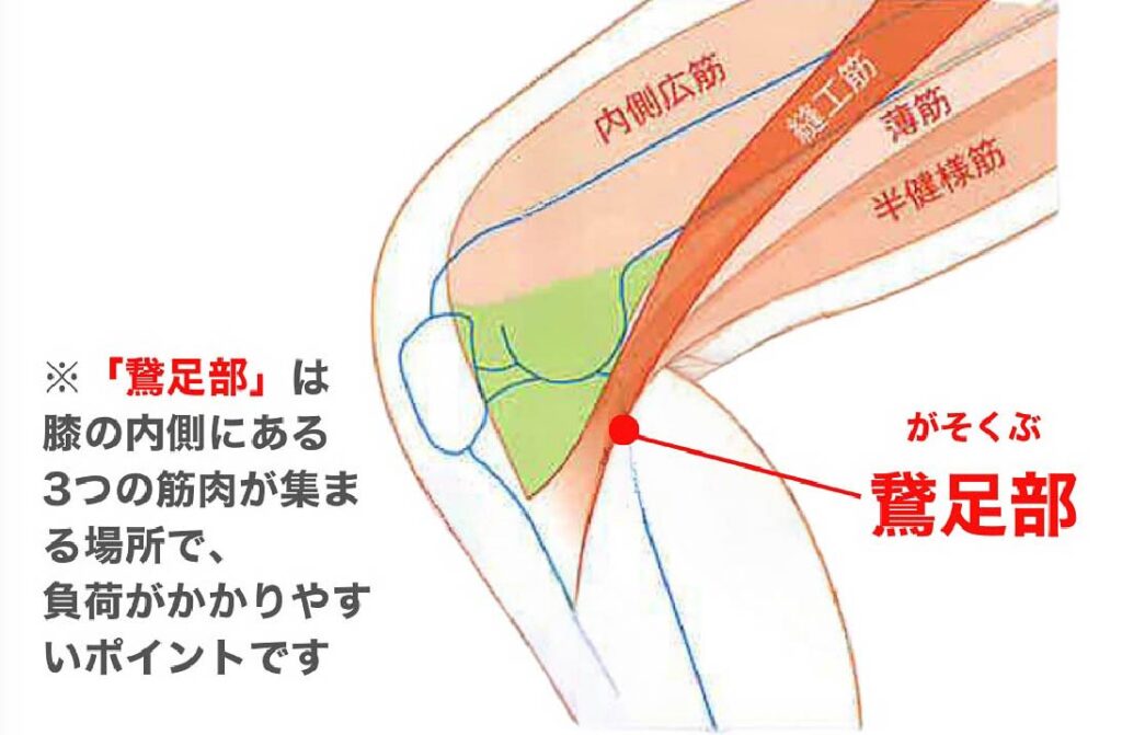 鷲足部の柔軟性が失われると摩擦による炎症が起き、ひざに痛みが生じます。