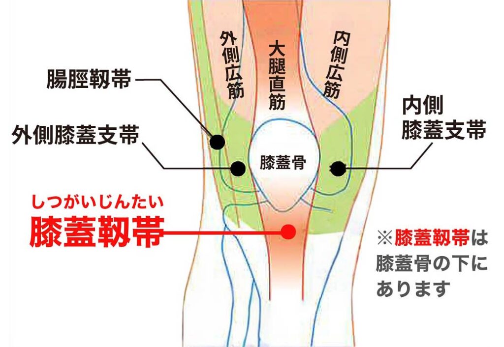 「膝蓋靭帯」は大腿直筋の付着部分にあたり大腿直筋を含む大腿四頭筋の柔軟性が低下すると膝蓋骨周辺の靭帯に負担がかかり痛みを引き起こします。