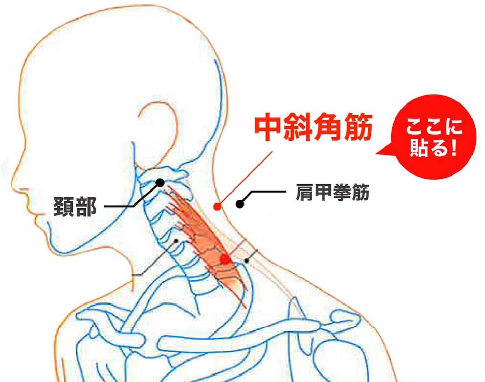 肩や首のしびれるようなコリ、痛みには中斜角筋上にソマセプト ミオを貼ることで改善が期待できます。