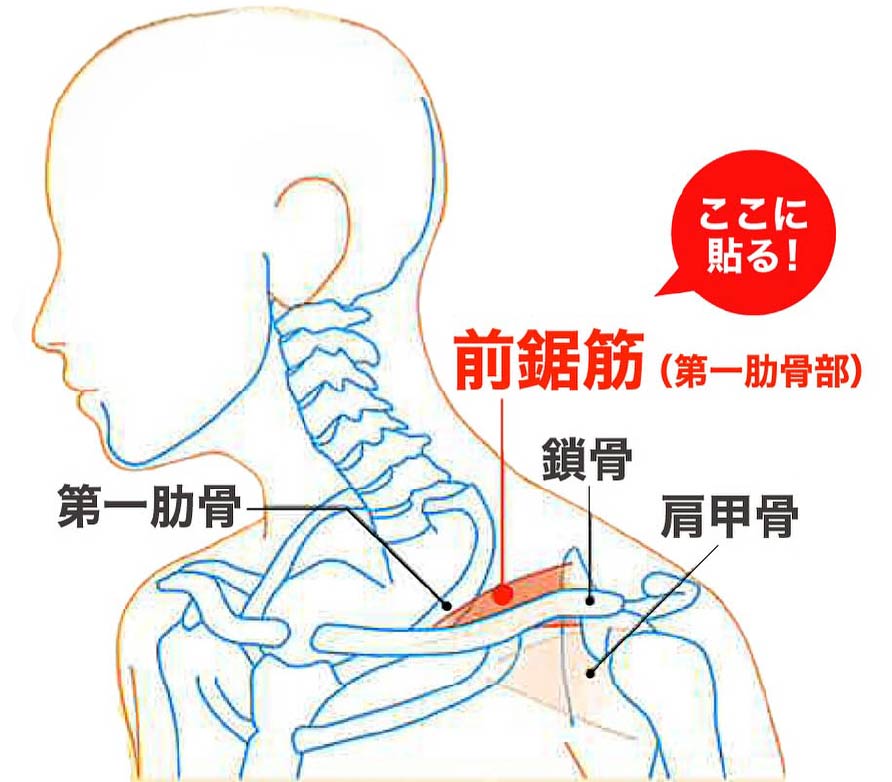 前鋸筋による肩こりは、第一肋骨部の前鋸筋上にソマセプト ミオを貼ることで改善が期待できます。